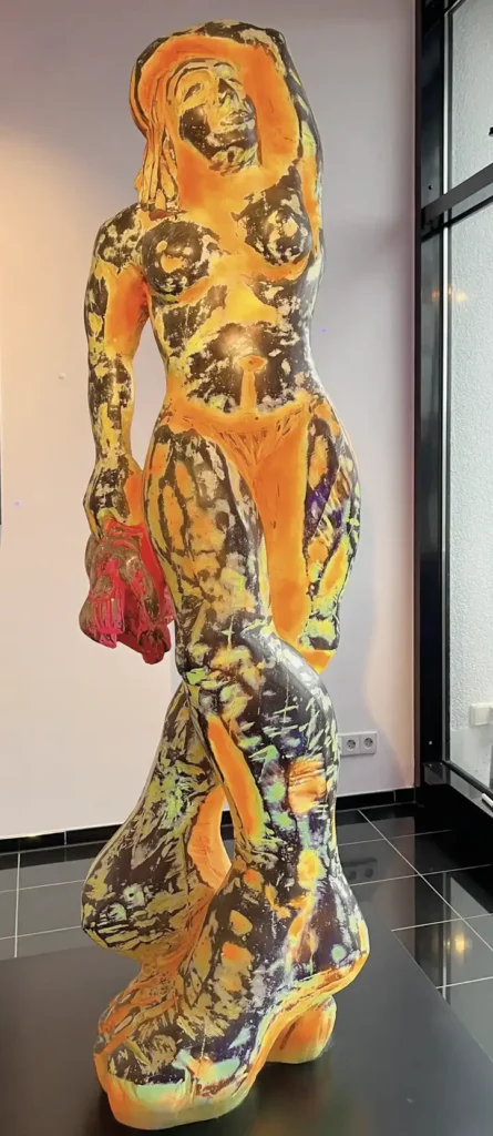 Seine großen bemalten Bronzefiguren haben wir von der letzten Ausstellung übernommen. Die Figuren, aus der scheinbaren „Ameisenperspektive“ gesehen, unterliegen manieristischen und proportionalen Veränderungen mit einer starken Körpersprache in Form und Fabe.
